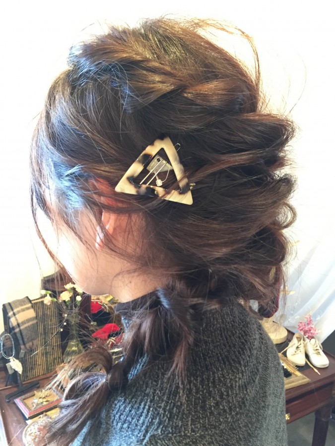 トップを二段に分けてねじって、ネープの毛は三つ編みにしていきます♪