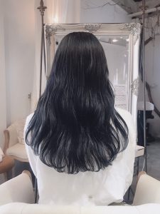 青味の色素がかなり濃いカラー剤を使ってしっかり明度を落として